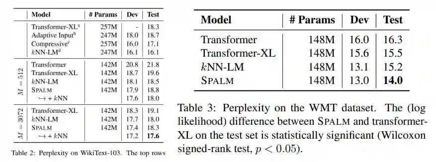 。该模型通过缓存局部隐藏状态(local hidden state)(其类似于 transformer-XL)使用扩展的短期上下文,并通过在每一时间步检索一组最近邻 token 使用全局长期记忆。研究者设计了一个门函数以自适应地结合多个信息源并做出预测。这种机制使得语言模型可以根据上下文来临时使用局部上下文、短期记忆、长期记忆或三者的任意组合。与强基准方法相比,研究者在基于单词和基于字符的语言建模数据集上验证了该方法的有效性。