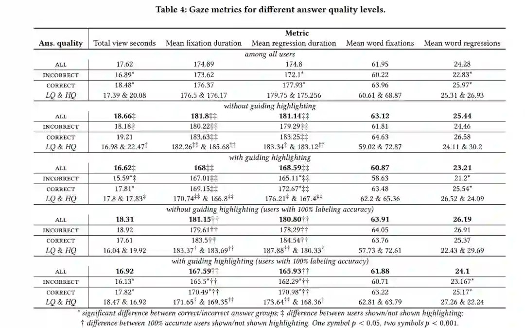 用户的任务是评估答案的质量、正确性、完整性和简洁性。答案中的单词也会被注释:既通过用户标记显式地标注,也通过从眼球追踪获得的用户注视数据中隐式标注。