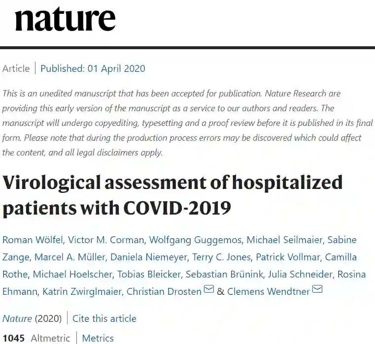 《自然》杂志今天在线发表的一篇新冠病毒最新研究论文。来自德国的科研团队通过对来自慕尼黑的新冠肺炎患者进行详细病毒学分析,研究了 9 名新冠肺炎确诊中青年患者的病毒排出情况。