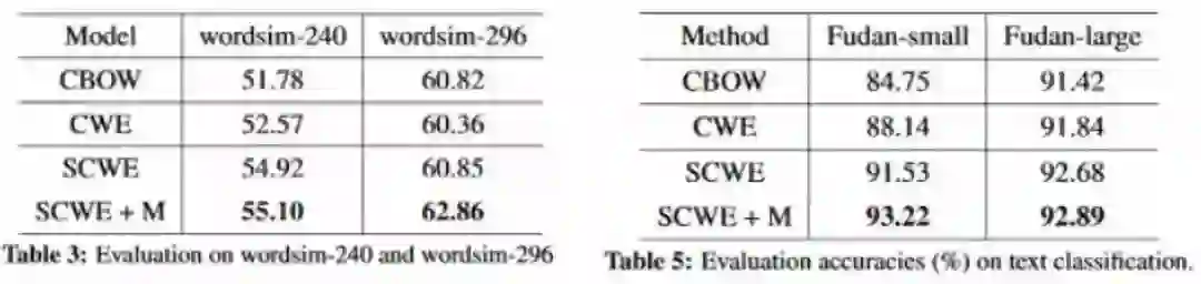 在 Word Similarity 和 Text Classification 上验证了其有效性,Word Similarity同样采用的评测文件是wordsim-240,wordsim-296,Text Classification采用的是 Fudan Corpus,具体的实验结果如下图: