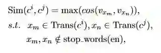 通过计算相似度来消除歧义,具体的公式如下, 其中c_i,c_j代表的是某个词中的第几个字,Trans(c_i)表示这个字的英文,stop-words(en)代表英文的停用词,x是Trans中的英文,具体来说,看上图,对于音乐这个词,c_1表示音,c_2表示乐,Trans(c_2)表示的是乐在上图中的英文集合,x_3就是pleasure或者是enjoyment。