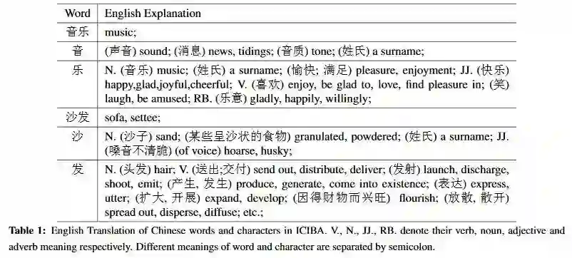 在中文中,相同的词和字符,虽然被应用为不同的词性,但是想要表达的语义信息是一样的。因此,这些被合并为一个,共用一个语义表示。如下图,多个乐字可能仅仅在不同的词性之间有所不同,然而语义信息几乎相同。