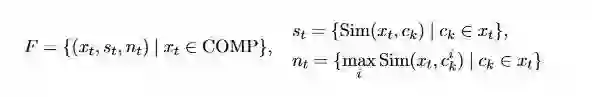 如果max(Sim(x_t, c_k)) > w, c_k是x_t中的第几个字,这样x_t就被定义为 compositional word,对于 compositional word 定义如下图,对于音乐这个词来说,就被定义为(“音乐”, {Sim(“音乐”, “音”), Sim(“音乐”, “ 乐”)},{1,1})。
