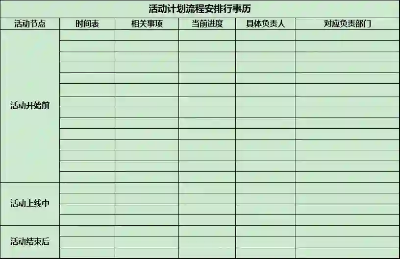 通常,在活动开始前的一周左右,活动运营的主导方,需召集活动上线后的各协作方(产品部、运营部、客服部、销售部等),进行活动的详细宣讲和问题答疑,并依据活动推广要求,制定详细活动上线——推广/营销期间的完整行事历,职责到人、时间精确到天,待大家达成统一,各方无异议后,然后贯彻执行即可。