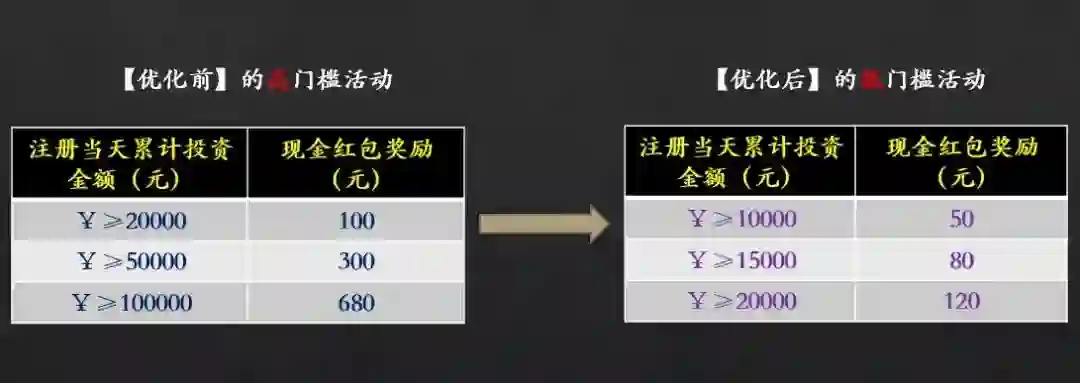 事后,对比来看两个活动,没想到一个门槛的简单降低(甚至奖励也降低了),却能将活动效果提升近乎3倍,的确匪夷所思。