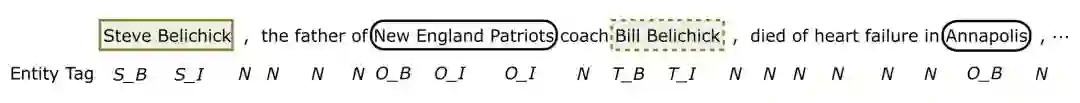 Action:action 会给当期的词分配一个 tag,tag 包括 A=({S,T,O}×{B,I})∪{N}。其中,S 是参与的源实体,T 是目标实体,O 是和关系无关的实体,N 是非实体单词,B 和 I 表示一个实体的开始和结束。可参看下图: