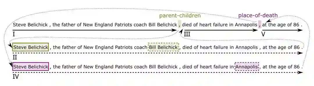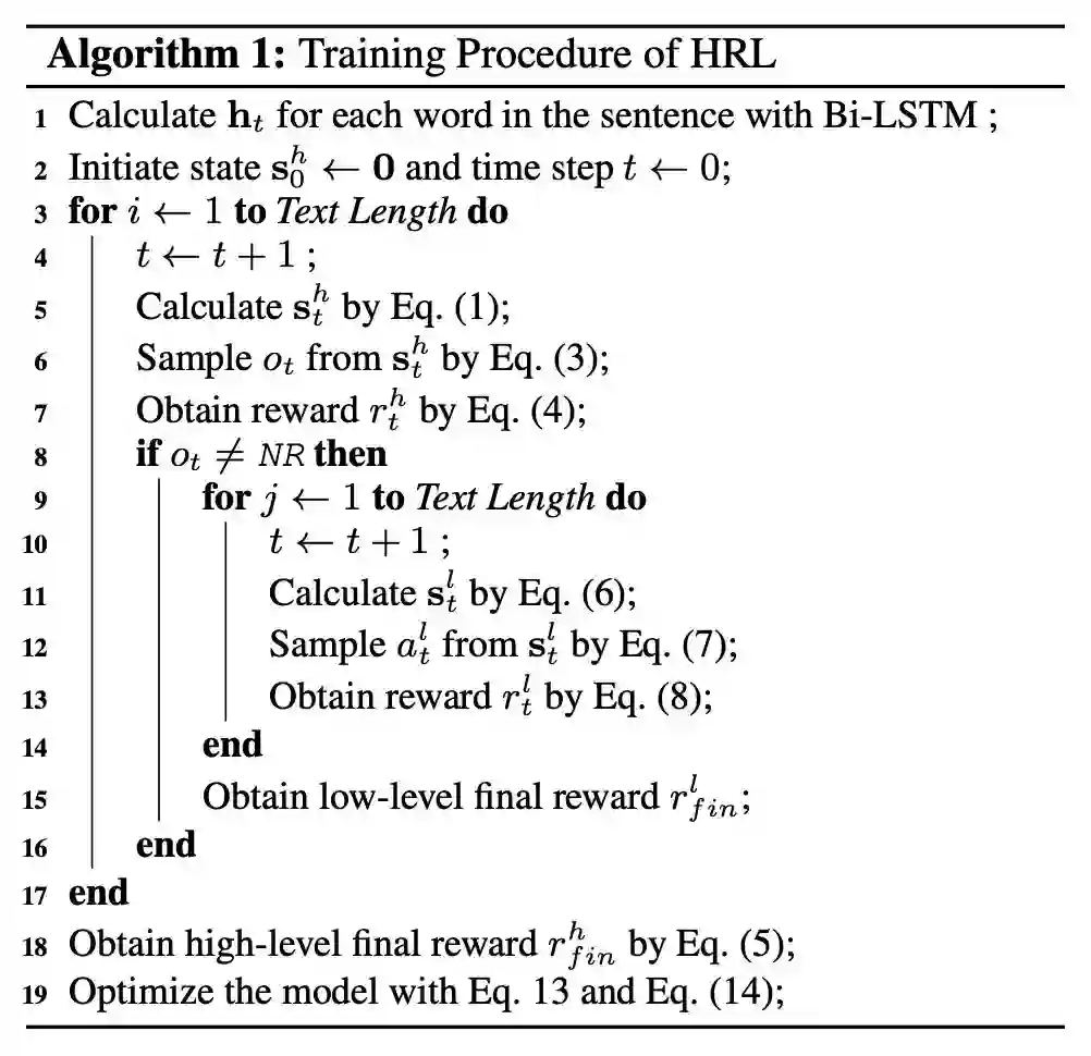 通过将任务分解成两个 RL 过程的层次结构,该模型有利于处理对于同一实体对具有多种关系类型的句子,或者一个实体涉及多种关系的情况。过程如图: