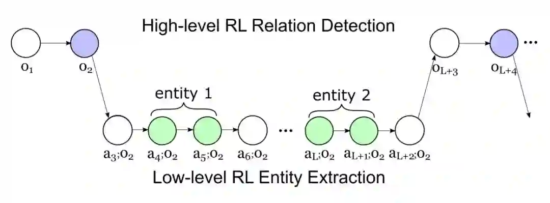 这种过程可以被表述为半马尔可夫决策过程:1)检测句子中关系指示符的高级 RL 过程;2)识别对应关系的相关实体的低级 RL 过程。