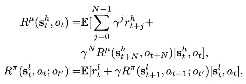 Option:option 在集合 O = {NR} ∪ R 中选择,当 low-level RL 进入结束状态,agent 的控制将被 high-level 接管去执行下一个 option。
