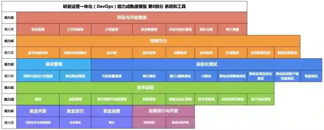 DevOps 标准评估体系主要包括敏捷开发管理、持续交付、技术运营、应用架构、安全及风险管理、系统和工具等部分的评估。目前,《研发运营一体化(DevOps)能力成熟度模型 第8部分 系统和工具》可正式开展评估。