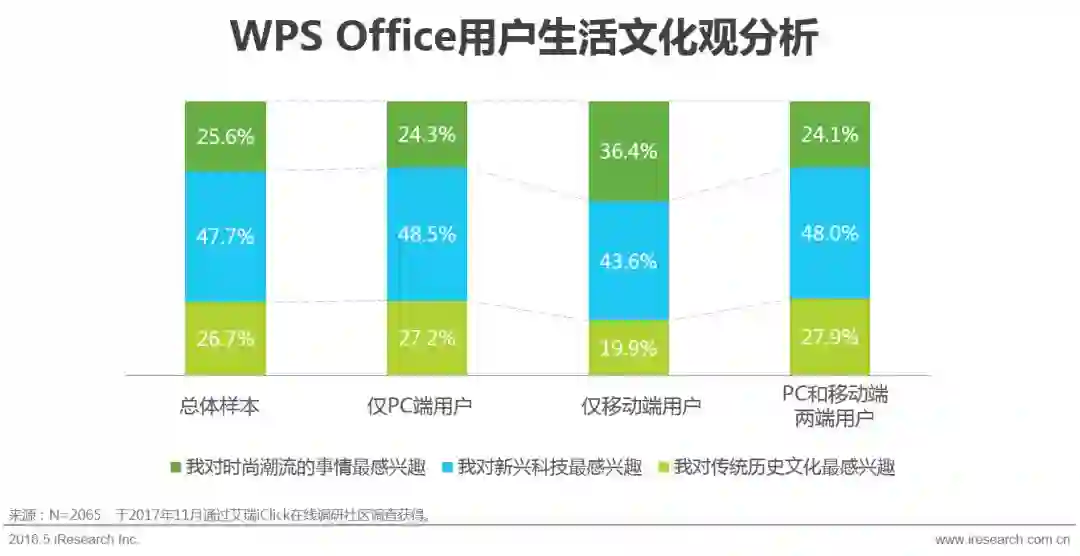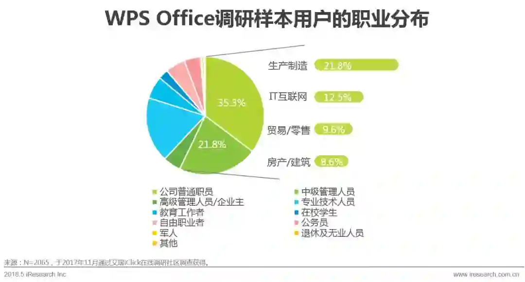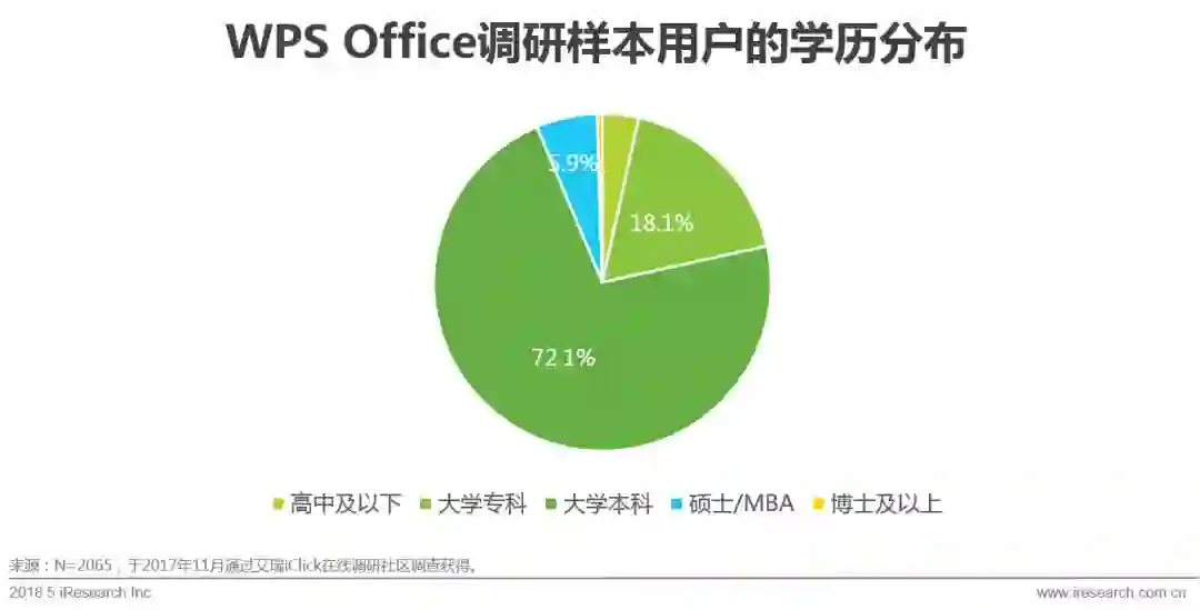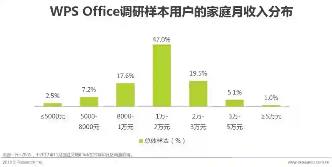 通过线上问卷的方式,本次调研共抽样获得2065名WPS Office用户,其中26-35岁的样本占总样本的65.1%,其次为36-40岁的用户(17.0%)。这一年龄段的用户正是城市中的核心工作人群,承担着一定的工作压力,可支配收入虽然尚在积累当中,但刚性消费需求较大。此外,本次调研抽样获得的WPS Office用户中还包括了10%左右的25岁及以下年轻学生人群,由此可见学校也是WPS Office的使用场景之一。总体来说,WPS Office用户结构健康,为产品的持续稳定发展奠定了基础。