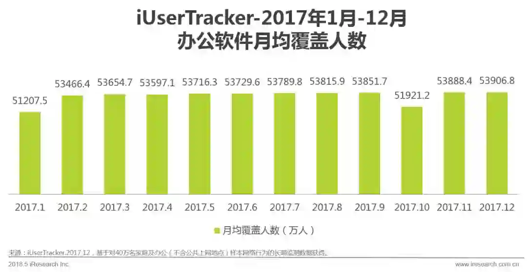 在高度成熟的PC市场中,办公软件又是其中发展历史相对悠久的类型,用户规模基本保持稳定。整个2017年,除去1月和10月受春节和国庆假期的影响导致PC端办公软件用户活跃数小幅下降外,其余各月的月均覆盖用户均在5.3亿上下小幅波动,预计这一数字在未来几年仍不会有太大变化。一方面,在PC端网民发展趋于稳定的背景下,PC软件市场进入存量阶段,但是由于办公软件的本身产品特点,该行业仍会长期保持较高的活跃度;另一方面,受场景和设备限制,移动办公仍无法完全替代PC办公。随着中国产业结构的升级改造,更多的传统企业会走向全面数字化,企业主体数量也不断增加,PC办公软件仍然具有一定成长空间。