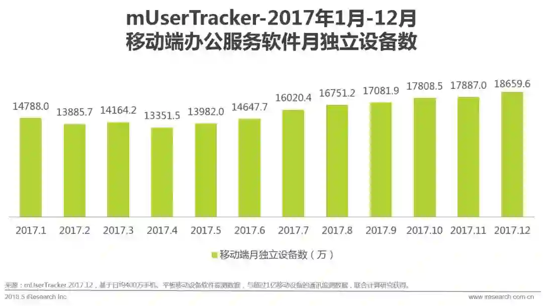 随着人们的生活服务向移动端迁移,移动办公服务软件的渗透率也在稳步上升中。2017年上半年,移动端办公服务软件月独立设备数基本稳定在1.4亿左右。而从下半年开始,移动端办公服务软件月独立设备数开始稳步上升,并在2017年12月达到1.86亿。