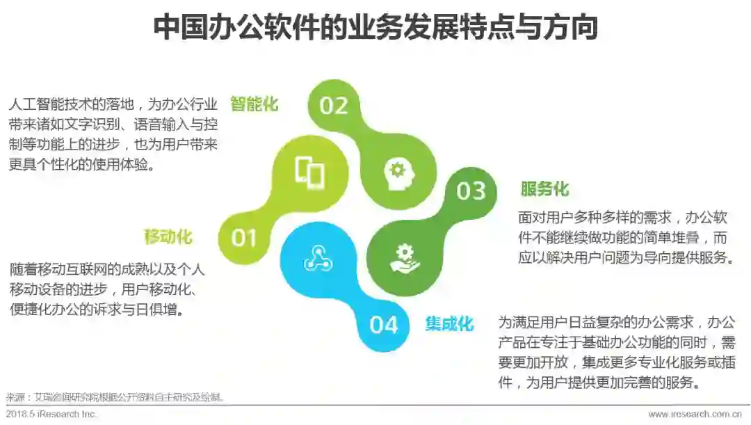 随着移动互联网的普及,移动端产品越来越成为厂商发力的重点。而针对办公软件行业,传统的PC端办公仍是用户处理办公文件时不可替代的方式,但在传统的PC办公场景之外,用户随时随地进行移动办公的诉求与日俱增。在PC端办公软件保持持续稳定的发展背景下,移动办公将作为有效补充,丰富办公软件的使用场景。除此之外,随着人工智能技术的落地与产品服务思路的转变,办公软件产品也呈现出智能化、服务化、集成化的特征与发展方向。