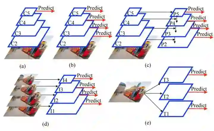 (a) No method. (b) Backbone pyramids. (e.g., SSD). (c) Feature pyramids (e.g., FPN). (d) Image pyramids (e.g., SNIP). (e) Image and feature pyramids. (e.g. TridentNet)