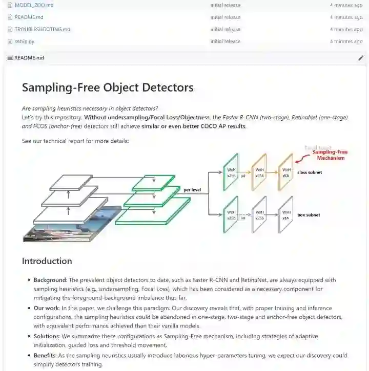 我们可以看到,几乎所有的 sampling heuristics 都基于启发式,并且具有大量的超参数需要调整。例如,OHEM 需要调 mini-batch size 和 fraction,Focal Loss 需要调 α 与 γ,GHM 有一些必要的前提假设与区间 M 需要调。正如 GHM 文中所说,解决不平衡最佳的策略(分布)是难以定义的。因此,我们重新回顾了 foreground-background imbalance,来探讨 sampling heuristics 是否必要。我们认为,不像一般的,由数据引起的不平衡,foreground-background imbalance 在训练和测试中是具有等同分布的;而使用采样,可能会改变这种分布,并不一定会在测试中取得更好的结果;但不使用采样,就会陷入难以训练的境地。我们发现,从初始化,损失,推理三个方面辅以适当的策略,即可在没有任何 sampling heuristics 的情况下,总是可以达到更好的检测精度。我们开源了相关代码(