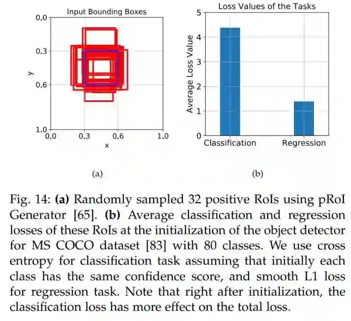 一般来说,分类任务的损失要比回归任务的损失要大一些,这是因为回归只做 foreground example,而分类要做到所有的 example。其实调过 Faster R-CNN 的小伙伴应该知道,在 RoI-subnetwork 阶段, classification 大约是regression 的 2~4 倍,就如同下面这张图: