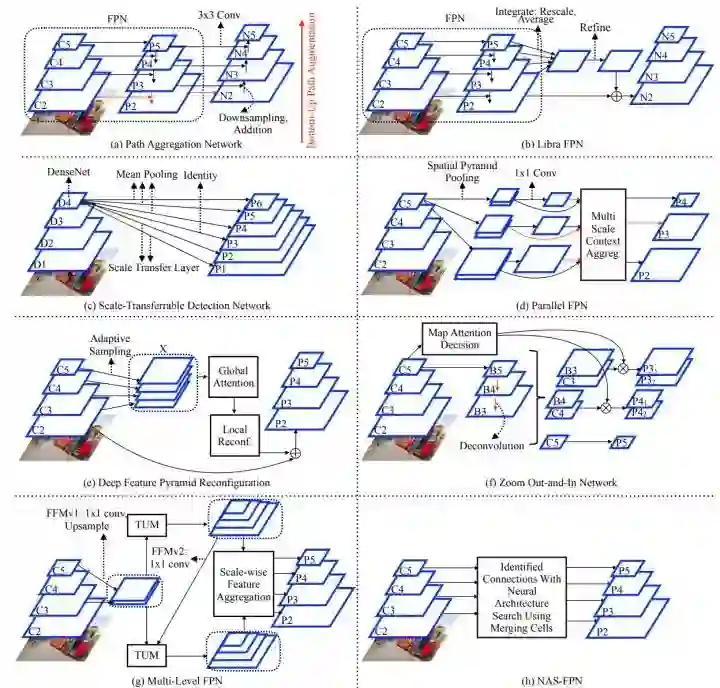 这种不平衡主要是指 FPN-based architecture 里,层级之间特征的不平衡性,Low Level 和 High Level 的特征之间互有定位/语义之间的优缺点,如何 mitigate 这种不平衡来达到最佳的检测效果?而解决方案也大多是结构上的,来看看下面各式各样的连接方法: