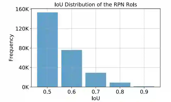 IoU Imbalance 是指 bounding boxes 在 IoU 段的分布上呈现出明显不均匀的分布,Libra R-CNN 和 Cascade R-CNN 都探讨过这个问题。在 negatives 上,IoU 在 0~0.1 范围内的样本占据主导;在 positives 上,IoU 在 0.5~0.6 之间的样本占据主导。