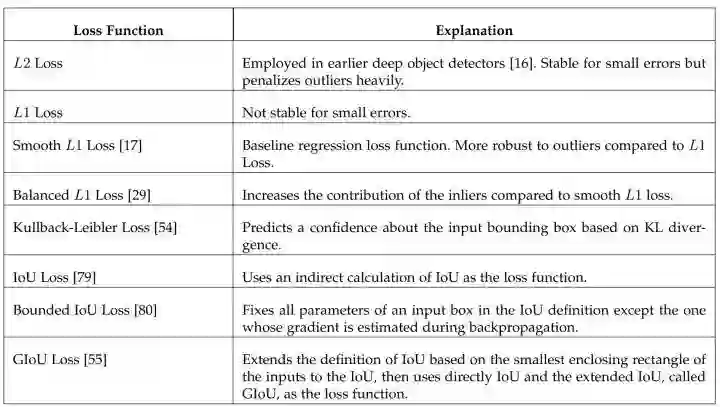 Smooth L1 Loss 由 Fast R-CNN 提出,降权了那些过大损失的样本(可能是 outliers)。Balanced L1 Loss 由 Libra R-CNN 提出,提升了 inliers 的权重,即相当于进一步降低了 outliers 的权重。其他的研究如下所示: