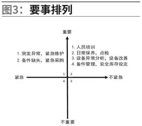 要重视第二象限的工作,从而降低第一象限事件的发生几率,设备管理理念由设备维修转向保障设备稳定,其目的在于将设备综合效率达到极限。