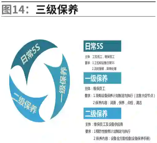 设备运维过程中,我们通常分为三级保养及依据工作量大小和难易程度,分为日常保养、一级保养和二级保养。在保养过程中生产、设备、设备供应商担当不同的角色任务,如图14。