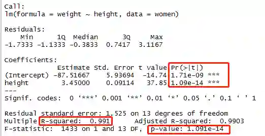 再看截距项和系数,都通过了t检验,且height的系数为正,表明随着身高的增长,体重也增长,符合客观事实。