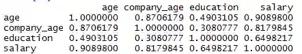 可以看到salary与其余三个变量都有比较明显的正的线性相关关系,另外age和company_age也有明显的正相关。