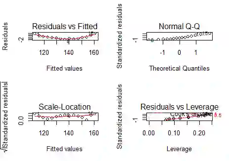 左上图:残差与拟合图,理论上散点应该散乱的分布在横线两侧,但是此图明显有一个曲线关系,说明我们的模型需要加入一个二次项(这一点从散点图亦可以看出来)。