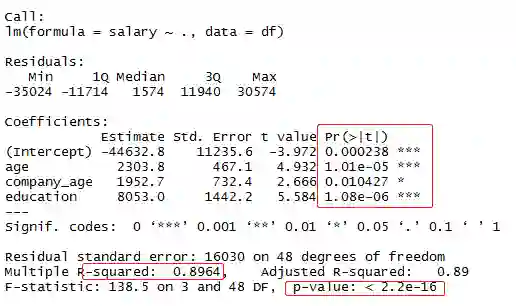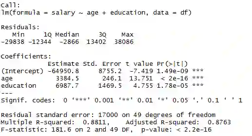 fit <- lm(salary ~ .,data = df) # 用.表示数据框中的其余变量