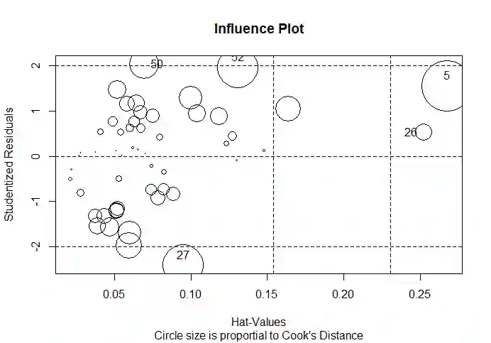 # 圆圈大小与影响成比例,圆圈很大的点可能是对模型参数的估计造成的不成比例影响的强影响点