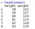同样,我们仍然使用R中自带的women数据集,来看一下数据样式: