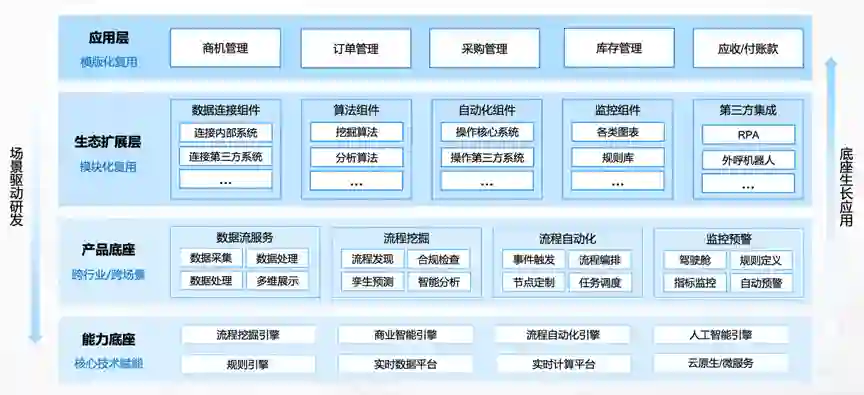 现在已发布的产品模块包含数据流服务、流程挖掘、监控预警和流程自动化等。