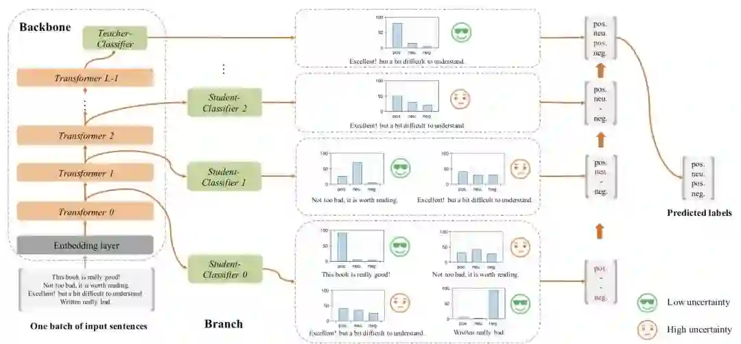 输出简单样本的预测结果,减少模型的计算负担,从而提高推理速度。虽然每层都多了一个分类器,但分类器的计算量也比Transformer小了两个数量级,对速度影响较小。后续的分支自蒸馏也设计的比较巧妙,可以利用无监督数据不断提升分支分类器的效果。