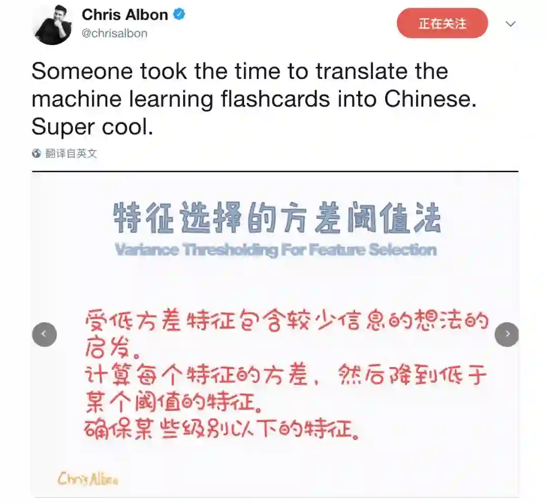 首批小抄表刚刚完成时,我们战战兢兢的把几张汉化作品发给了原作者Chris Albon,大咖不仅回复了我们,还在推特乐呵呵的po出了我们的成果:“有人把小抄表翻译成了汉语!Super cool!”(被大咖表扬笑出声!)