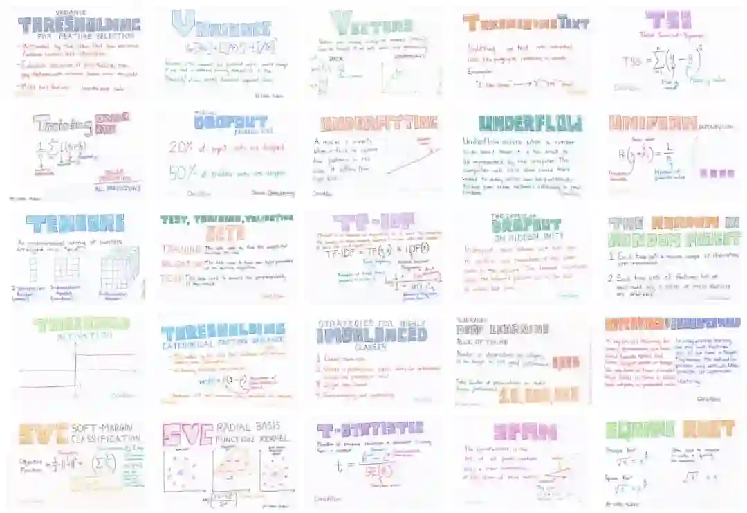 在他自己学习机器学习的时候,发现通过这样的小卡片理解和记忆机器学习相关概念,比单纯读教科书要有效的多。于是便总结了300+个机器学习概念,并用彩笔手绘、扫描,制作了这套精致的小抄表礼包。