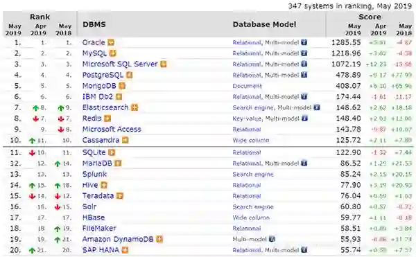 DB-Engines 数据库流行度排行榜发布了5 月份的数据,前六名的排名“千年不变”,分别是:Oracle、MySQL、Microsoft SQL Server、PostgreSQL、MongoDB 和IBM Db2。而其中,MongoDB以比去年同期超出65.96分的成绩继续雄踞榜单前五,这个增幅在全榜仅次于PostgreSQL的77.99,而其相对于4月份的6.10分的增长也是仅次于微软SQL Server排名全榜第二。