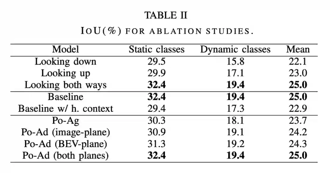 :表 2 最后一部分比较了 Po-Ag 与 Po-Ad 的变体。一个 Po-Ag 模型没有极化位置信息,图像平面的 Po-Ad 包括添加到 Transformer 编码器中的 polar encodings,而对于 BEV 平面,这些信息会加入到解码器中。在任何一个平面上添加 polar encodings 都比在不可知模型上添加更有益处,其中动态类的增加最多。将它添加到两个平面会进一步强化这一点,但对静态类的影响最大。