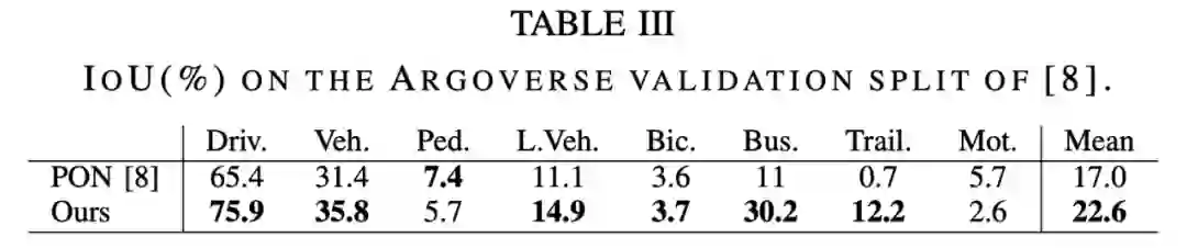 下表 3 中 Argoverse 数据集上的结果展示了类似的模式,其中本文方法对比 PON [8]提高了 30% 。