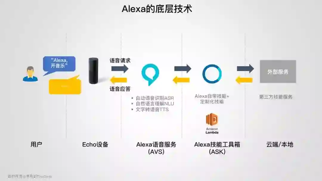 Alexa 主要通过 2 个核心服务连接开发者和消费者构建生态:AVS (Alexa Voice Service) 和 ASK (Alexa Skill Kit)。