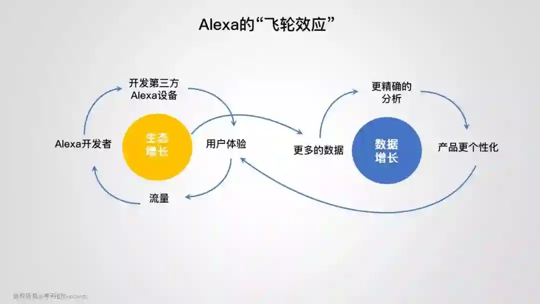 Alexa 的成功主要在产品、市场先机和开放策略。先从 Echo 单点爆发,迅速占领市场,形成第一道“护城河”。然后,利用开放的策略,吸引更多的开发者研发第三方的 Alexa 设备,满足消费者各种场景需求,用户体验不断提升,然后带来更多的流量,吸引更多的开发者进入,打造一个自给自足的生态循环,形成第二道“护城河”。另外,生态的增长,持续产生大量有价值的用户偏好数据,数据的反哺帮助 ML 算法优化,分析更加精确,个性化程度更高,客户的体验更好,形成第三道“护城河”。从用户流量,到开发生态,到数据反哺,持续优化模型,层层递进,形成一个让竞争对手难以复制的巨大壁垒,最终垄断市场。