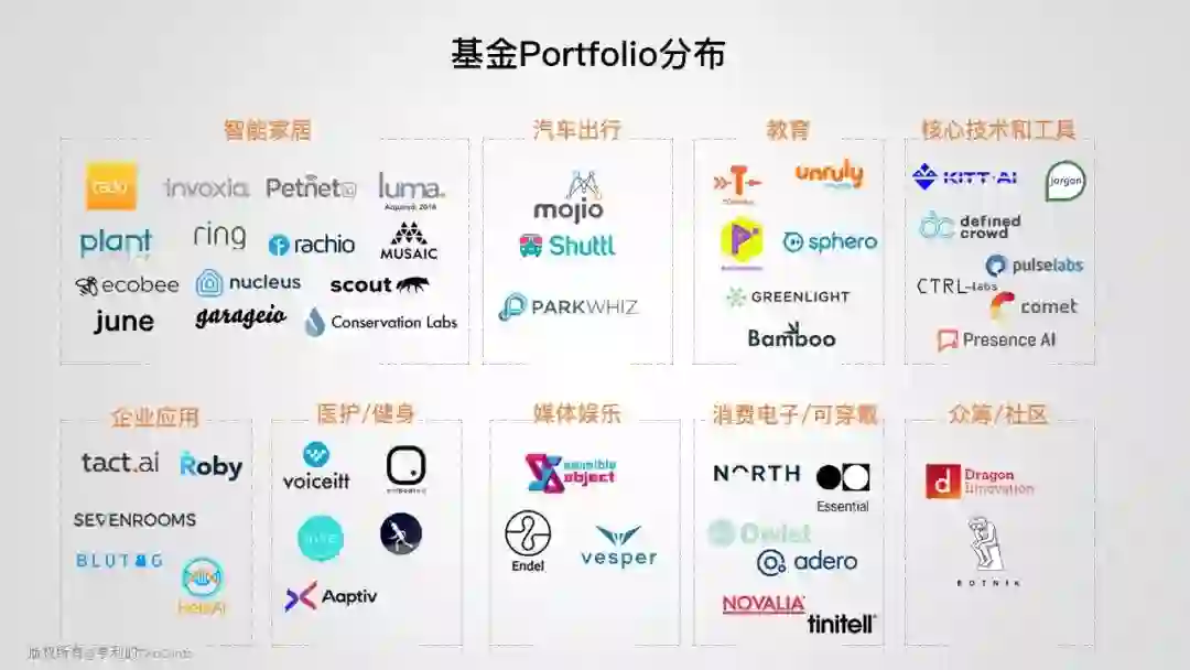 基金的 portfolio 有 3 家来自加拿大,7 家来自欧洲,1 家来自以色列和 1 家来自印度,其他均来自美国地区。领域覆盖了智能家居、汽车出行、教育、医疗护理、企业应用等领域。很明显,智能家居仍然是 Alexa 的重心,从智能冰箱贴、宠物喂食器到安防摄像头,共投了 14 家。其中智能门锁 Garageio、智能门铃 Ring、安全路由器 Luma、智能洒水系统 Rachio 均被收购。儿童教育也是 Alexa 的关注领域,结合语音技术和 IoT,赋能儿童 STEM 教育。