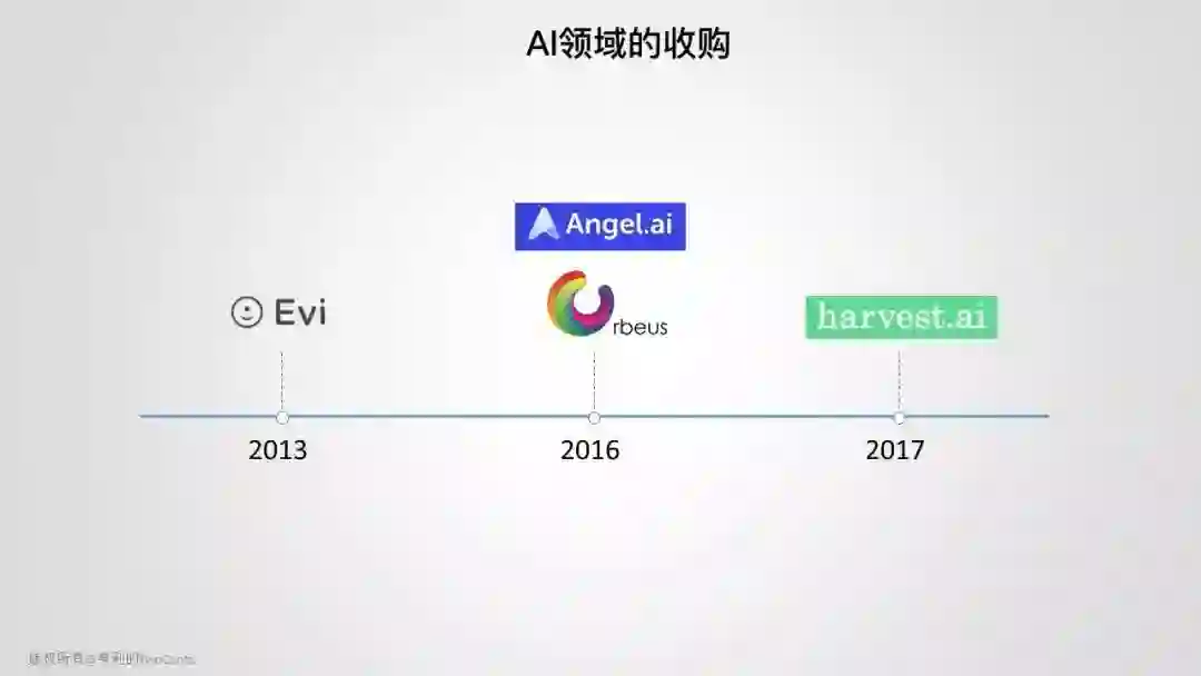 相对其他巨头,Amazon 在 AI 领域的收购稍显保守,但 Amazon Alexa 基金就非常 aggressive,后面会作介绍。2013 年,Amazon 收购了英国公司 Evi Technology,该公司当时开发了一款跟 Siri 类似的语音助手 Evi。据了解,Amazon Echo 的语音技术就来自于 Evi。