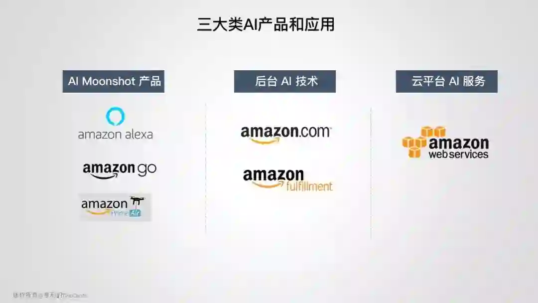 Amazon 的 AI 应用可分为三大类,一类是能“看得见、摸得着”的前沿技术 moonshot 产品,像 Alexa、 Amazon Go 和无人机 Prime Air;一类是“不可见、藏在后台”的 AI 技术,如推荐引擎、仓库机器人和 fulfillment 中心的“最后一公里”;另外就是企业级应用 AWS 云平台,提供 AI 工具和服务,让企业构建自己的 AI 应用。