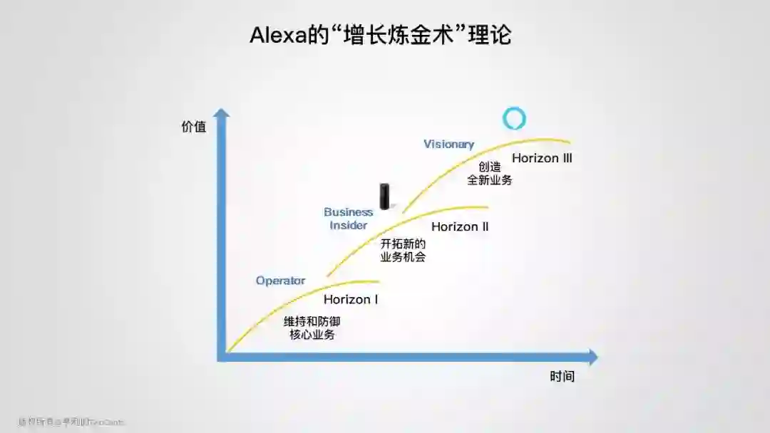 根据“The Alchemy of Growth”理论(中文: 增长的炼金术),企业有三个层次的增长。第一个层次是 Operator,维持当前业务的核心竞争力。第二个层次是 Business Builder,开拓新的业务增长模式和解决方案,扩展核心竞争力。第三层次是最高级别 Visionary,也是离公司的 comfort zone 最远的区域,创造独有的解决方案,开拓全新市场,实现业务爆炸性的增长。