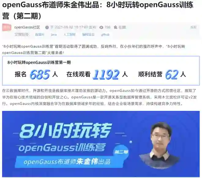 由于 openGauss 正在成为国内主流的数据库核心技术路线,所以为了让更多的数据库技术爱好者、从业人员能够更深入地了解 openGauss、备考 OGCA,“8 小时玩转 openGauss 训练营”往往都会设置 2 天共计 8 个小时的课程,由业界资深专家共同授课,内容充实且深度结合实践。训练营时间都挑选在周末,且全部课程免费,由训练营专家讲师团亲自把关作业和考试,对学生开发者十分友好。