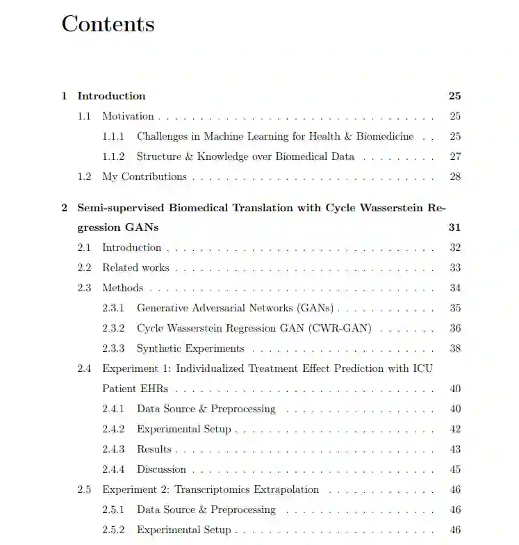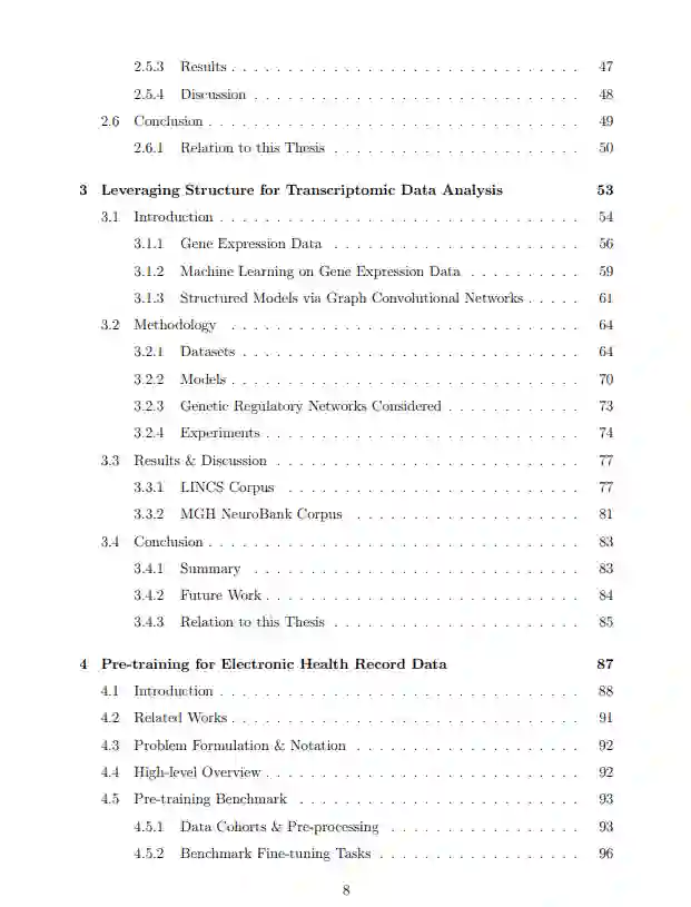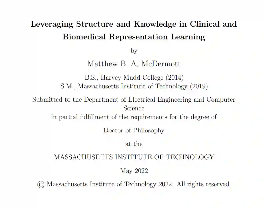 总的来说,在这篇论文中,我们将证明整合结构,无论是直接从数据中学习还是通过外部知识,都可以显著提高临床和生物医学机器学习的性能。