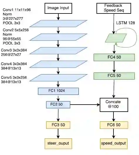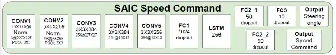 卷积层具有与基础转向模型中结构相同,被编码的视觉特征被馈送到LSTM层用于时间维度上的分析,进而输出图像序列特征用于转向角回归和速度指令分类。作为第一步,速度指令包含三个类:“加速”,“减速”和“保持速度”。其中,作者使用交叉熵进行速度指令的分类。