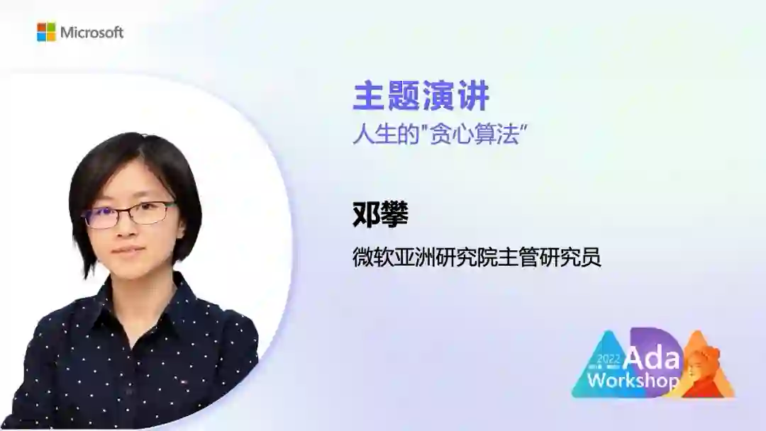 科研之路并非繁花似锦,很多时候是在一条没有脚印的道路上探索未知。科研之路应该怎么走?如何抓住机遇实现转弯?微软亚洲研究院主管研究员邓攀在以《人生的“贪心”算法》为题的演讲中,分享了自己从本科毕业到现在一路走来的经历与收获。从生物跨界到计算机,邓攀是如何做到“内心有谱,丝毫不慌”的?遇到机会,她又是如何竭尽全力把握住每一个可能的?一起来看邓攀怎样编写了自己人生的“贪心”算法吧!