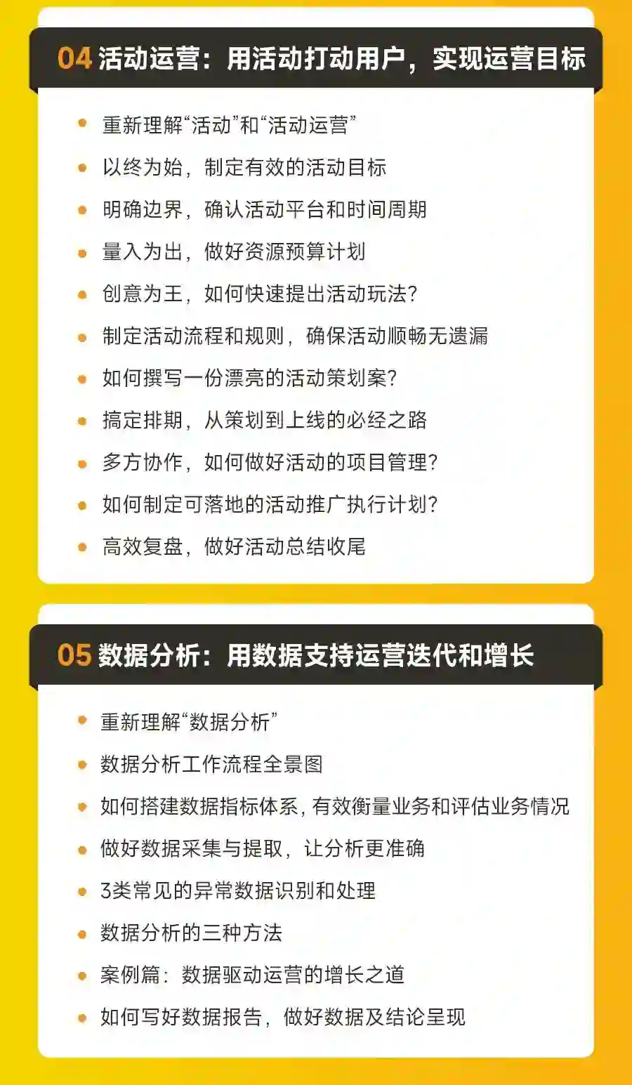 以下是课程大纲,可以看到每个版块都有很详细的知识点。学完这些内容可以帮助大家打通运营知识体系,在实际工作中就能站在全局的角度,更全面地考虑问题,和其他部门沟通协作也能游刃有余,更好地带动业务增长!